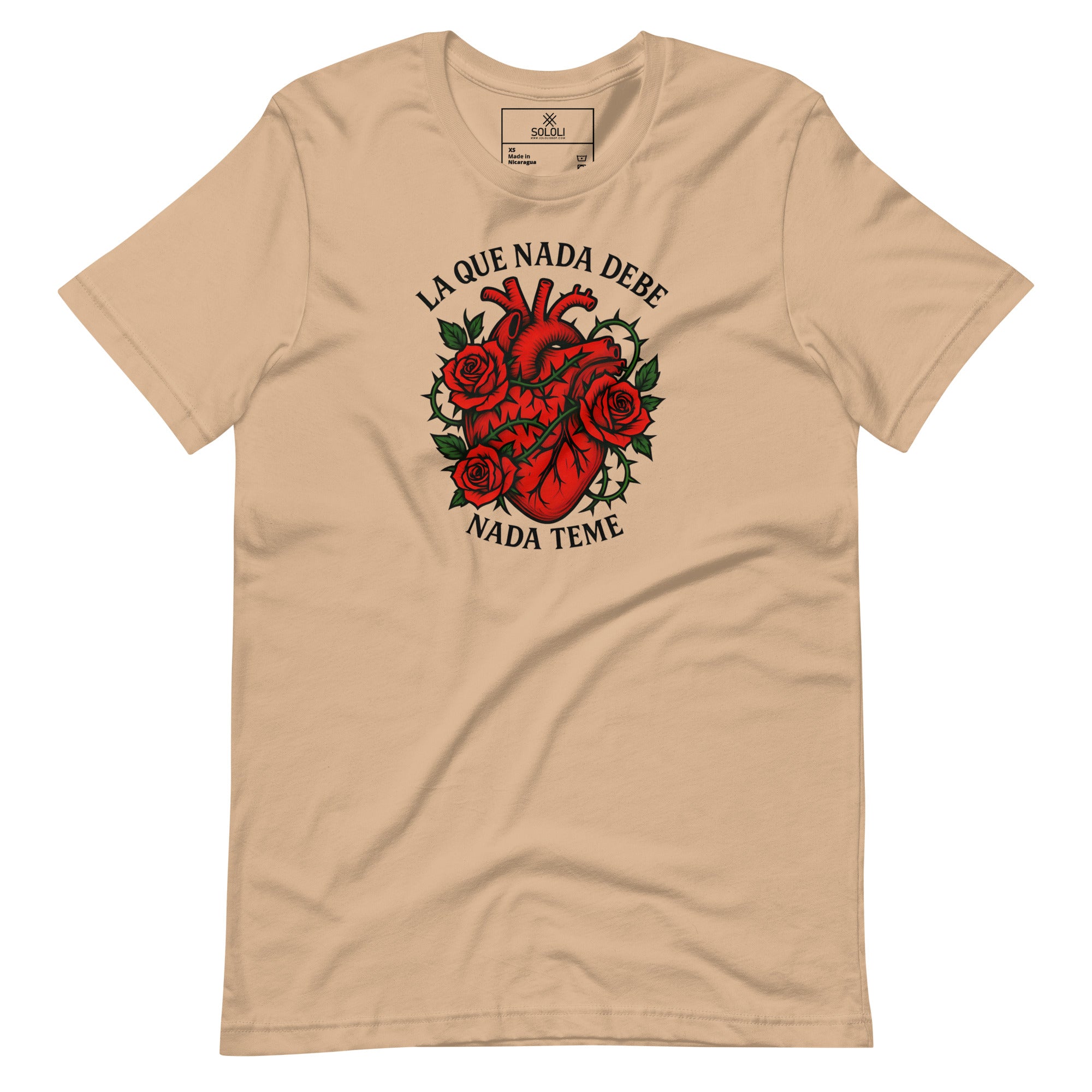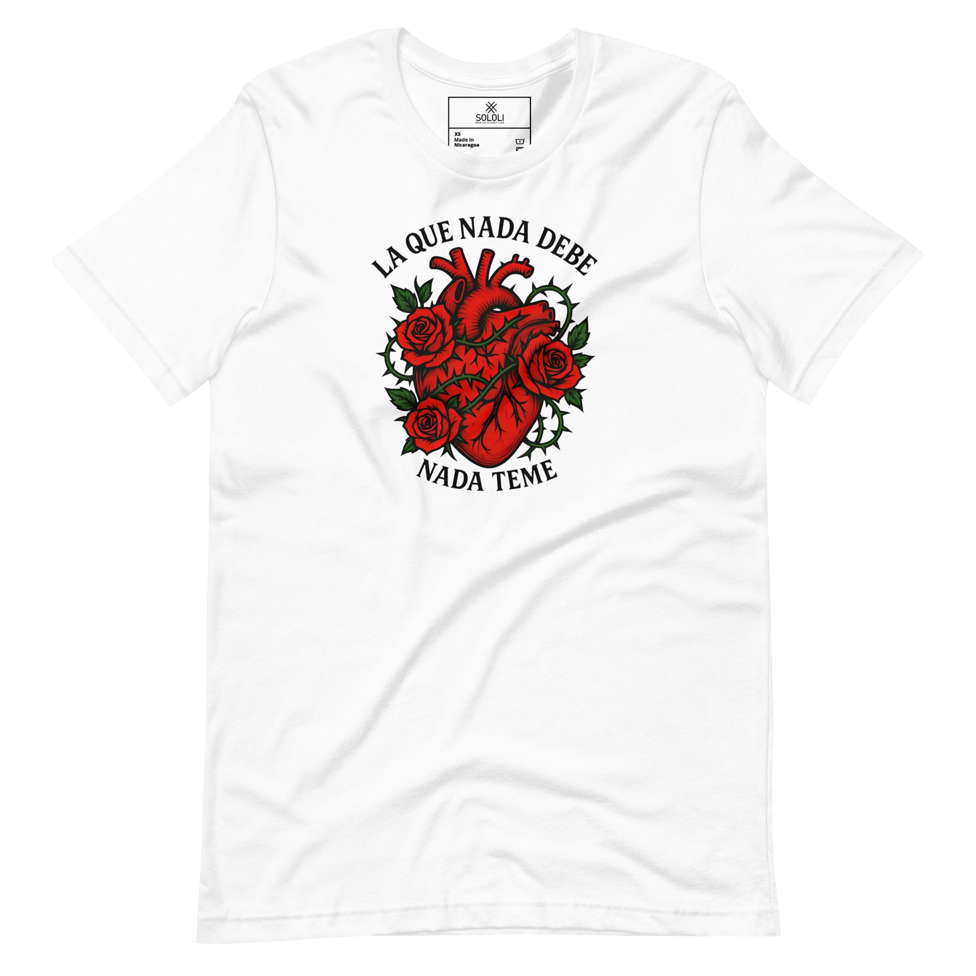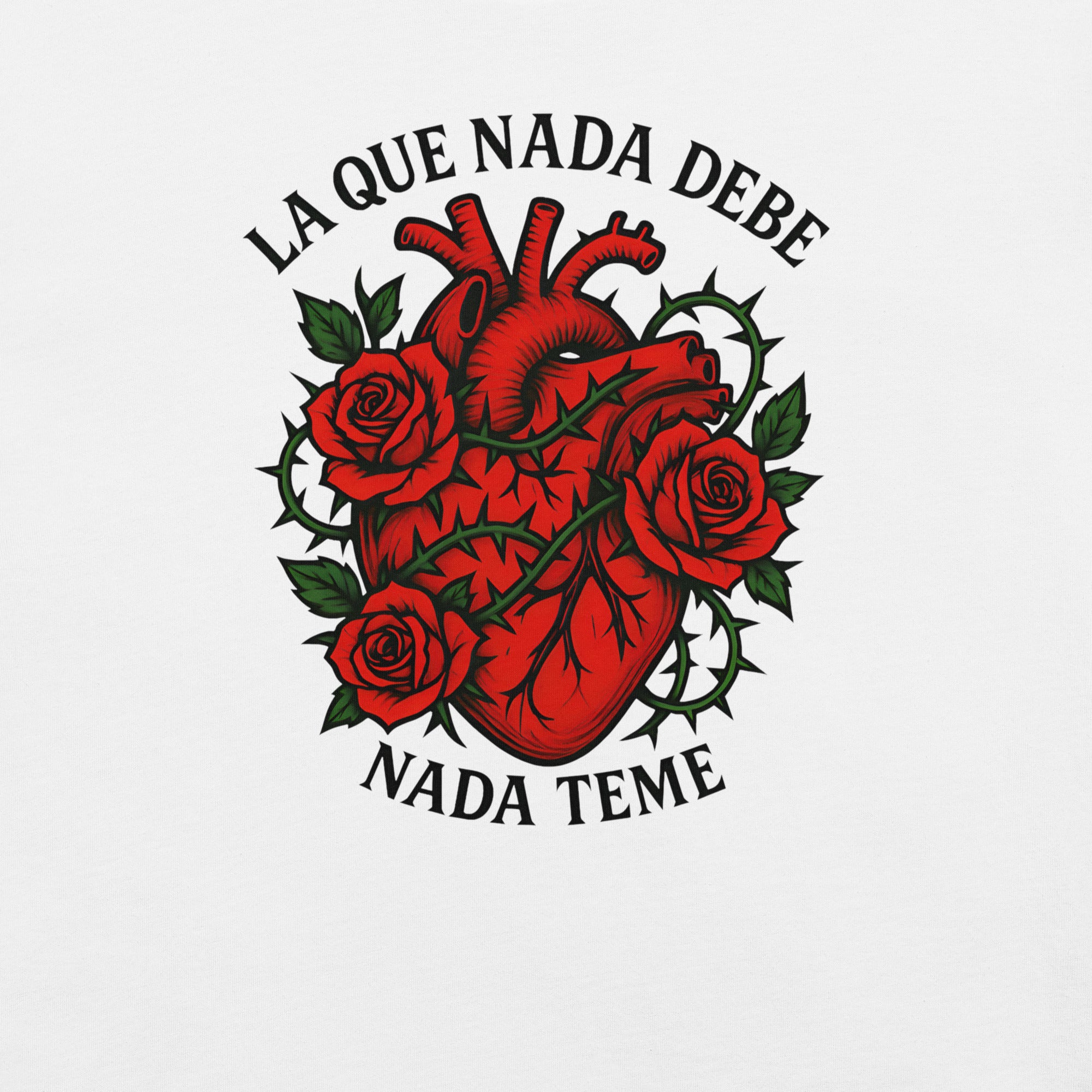 Own your power with the Nada Teme Tee, featuring the bold phrase “La que nada debe, nada teme” “She who owes nothing, fears nothing.” A statement of self respect, confidence, and peace of mind, wrapped in a striking heart and rose design that symbolizes strength through truth and love. Perfect for the unapologetic woman who stands tall and walks free.