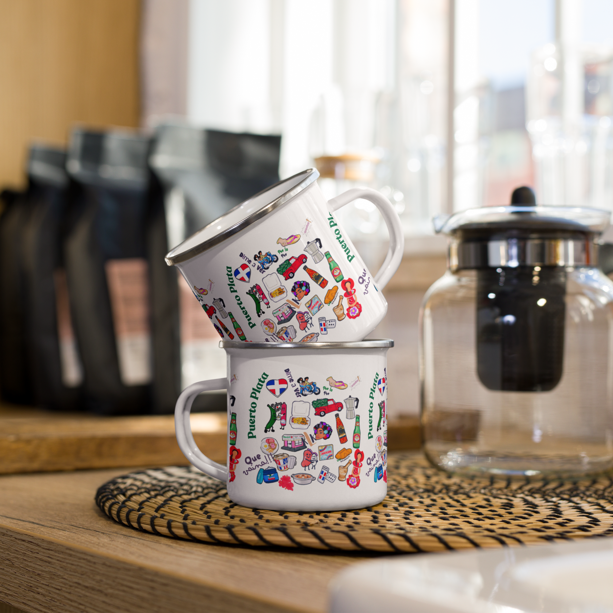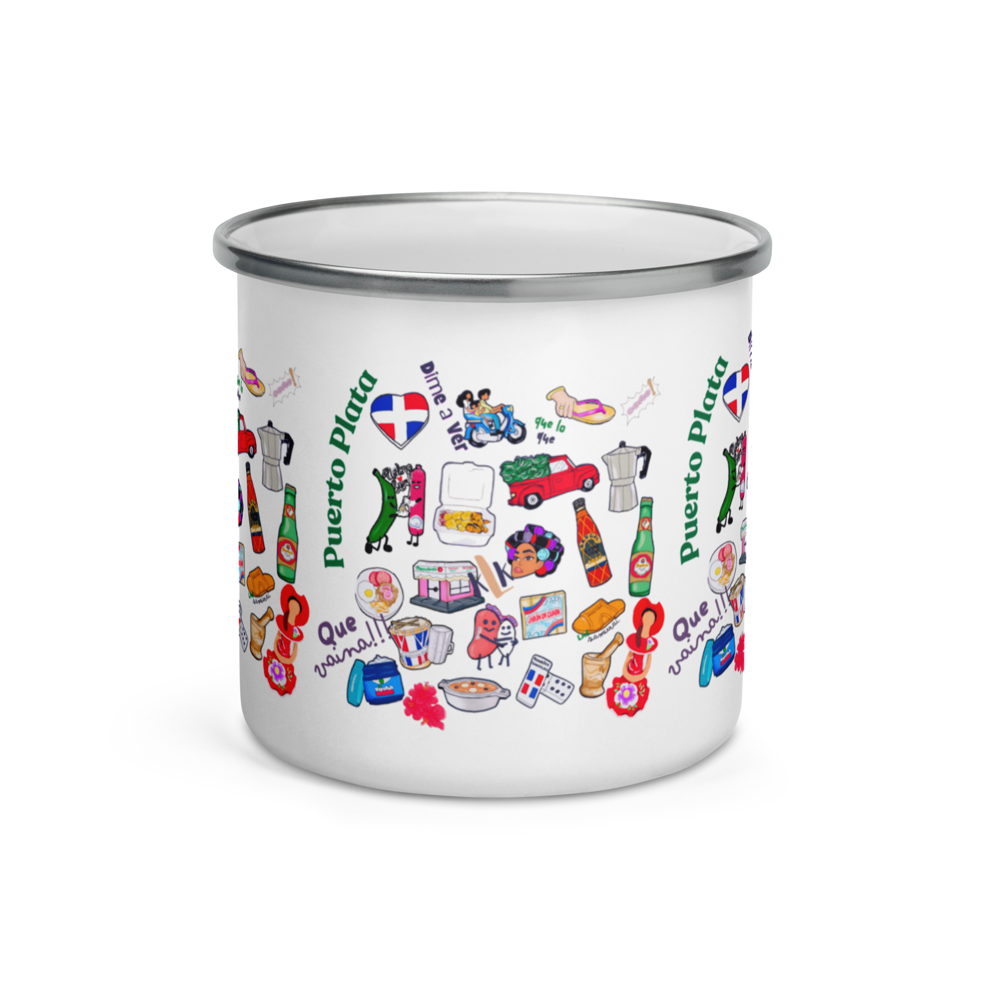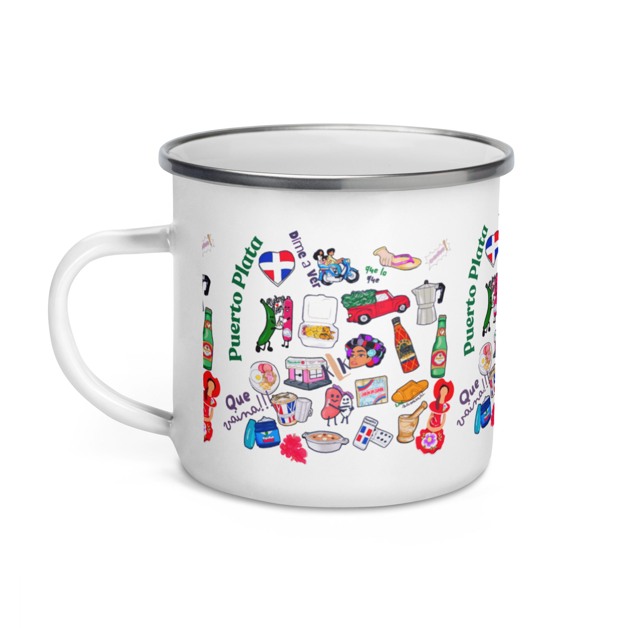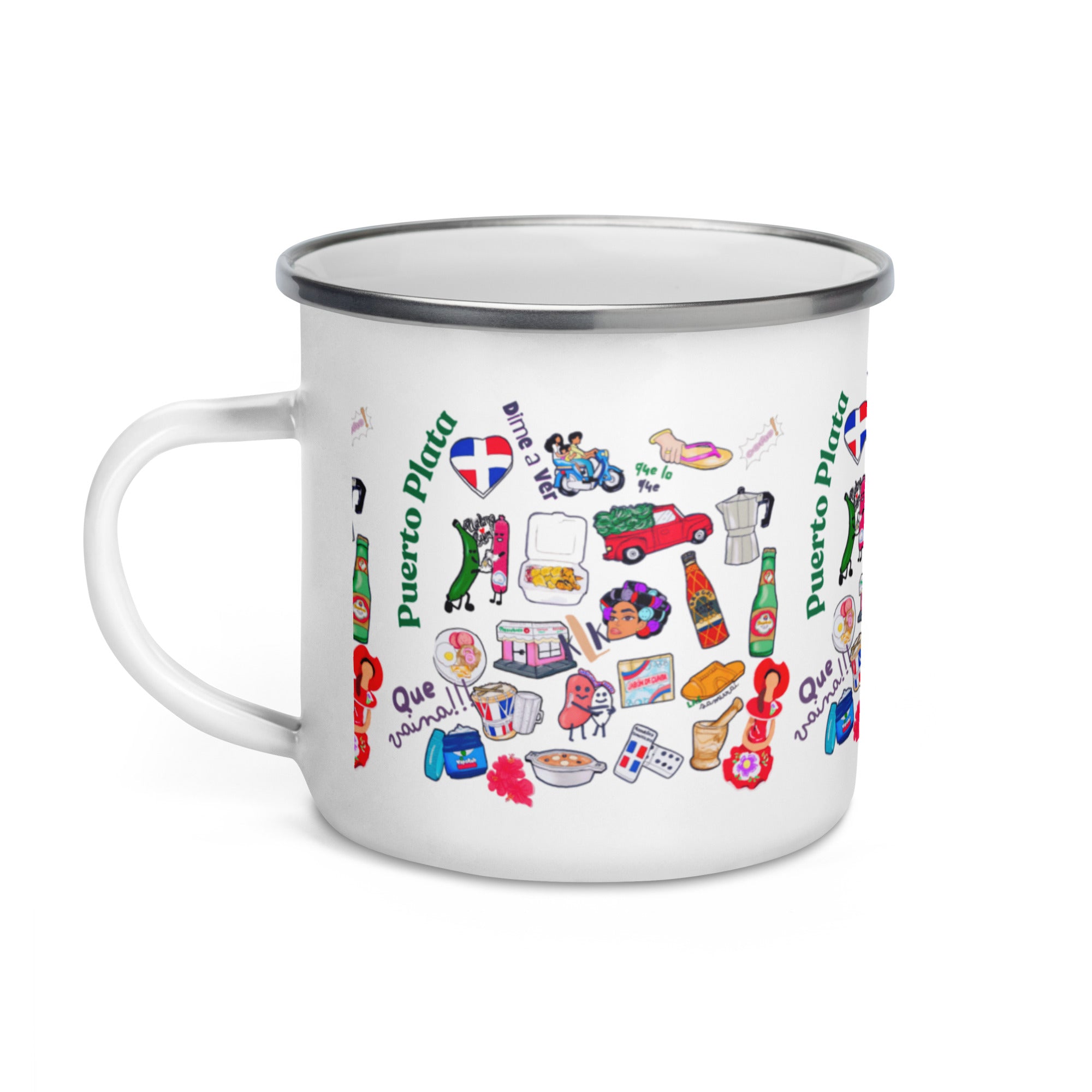 Sip your cafecito or té with a dose of puro Caribe. The Puerto Plata Vibes Enamel Mug is covered in colorful Dominican-inspired doodles motoconchos, frío-frío, dominoes, Presidente beer, sazón, música, y más that capture the everyday magic of la vida Dominicana.