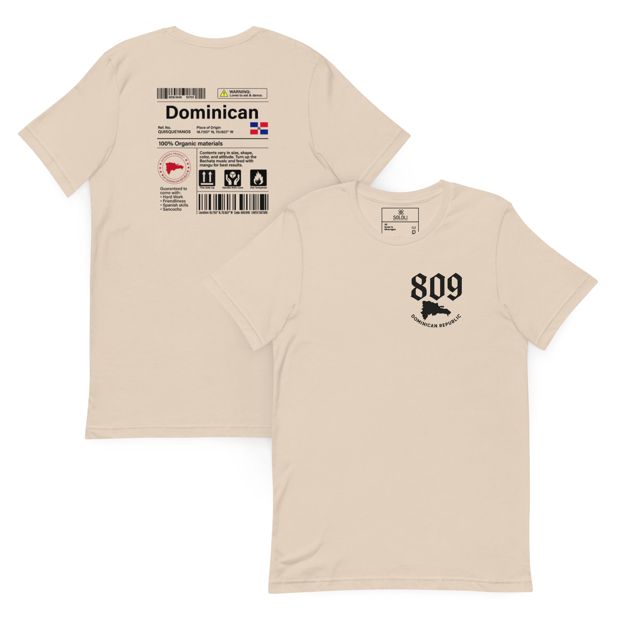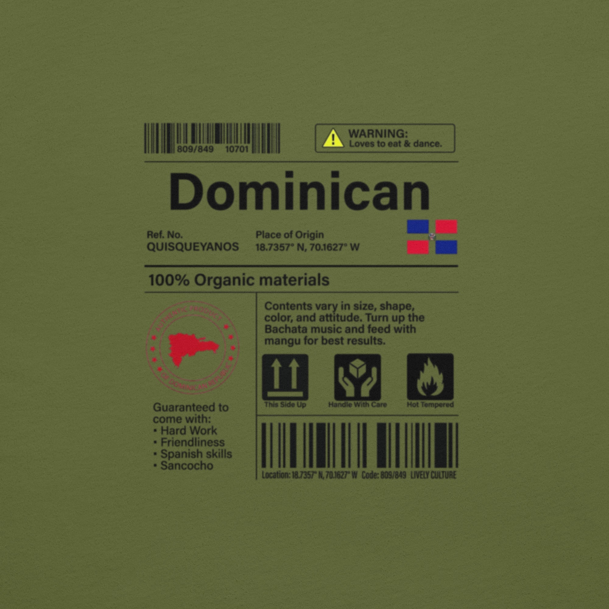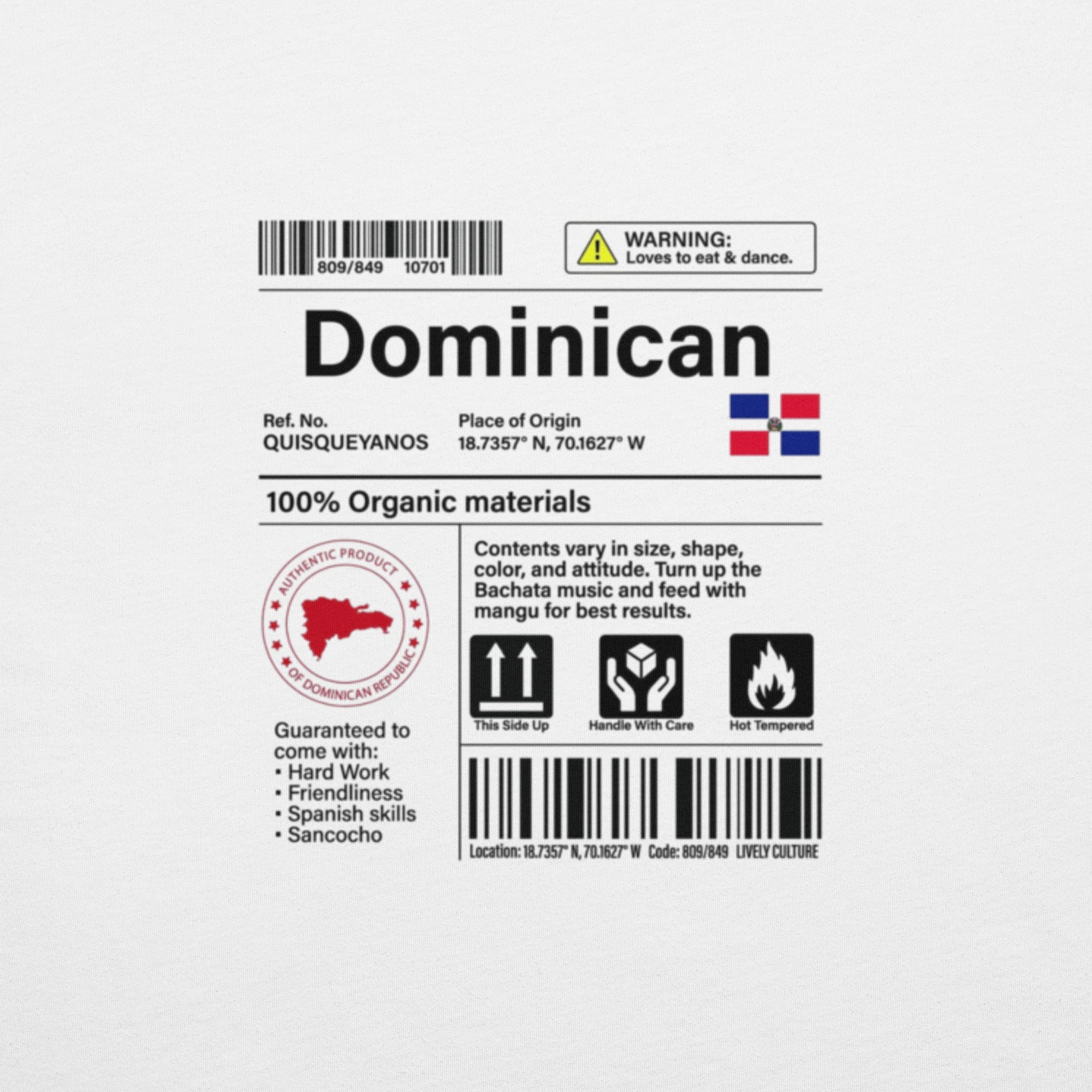 Wear your roots loud and proud with the Dominican Barcode 809 Tee. On the front, it keeps it clean and bold with the 809 and the map of the Dominican Republic. On the back, it flips the script with a barcode inspired design featuring playful details like “100% Organic Materials,” “Guaranteed to love rice, beans, and sancocho,” and even a warning label: Dominican vibes ahead.